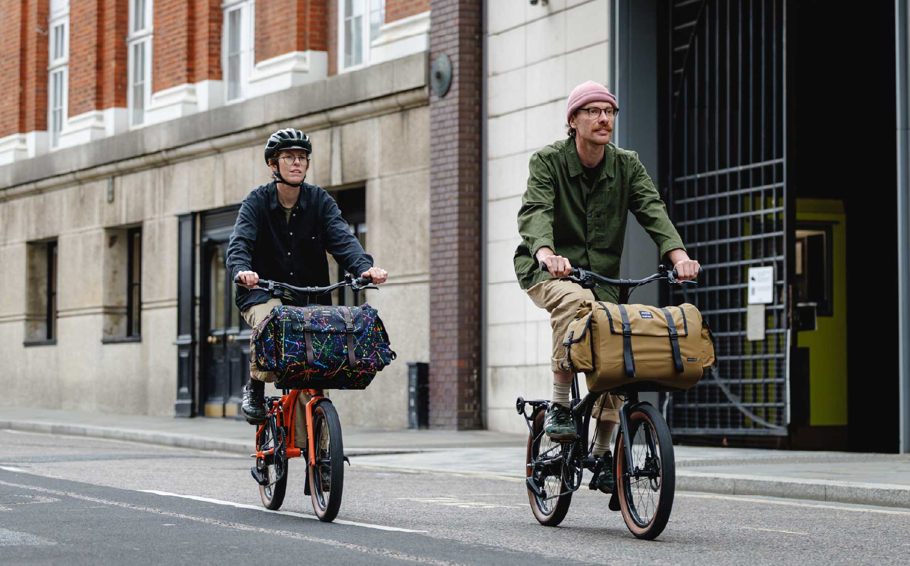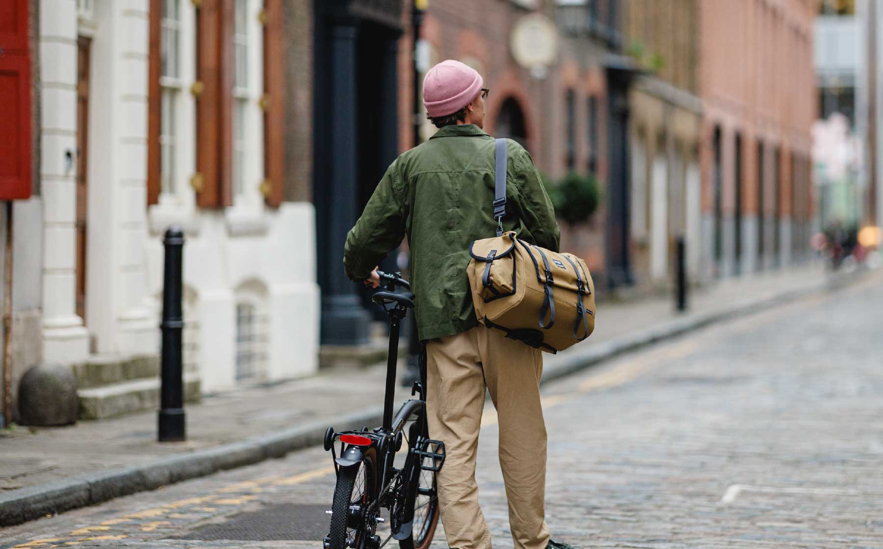 The included Brompton Bag Frame clicks directly onto the Brompton Carrier Block, a waterproof 25L main compartment, with roll-top closure, provides ample and expandable storage. The hardshell construction keeps its cute shape (even when empty), a network of pockets and clever details ensures every item has its place — from your water bottle and phone to those all-important snacks.