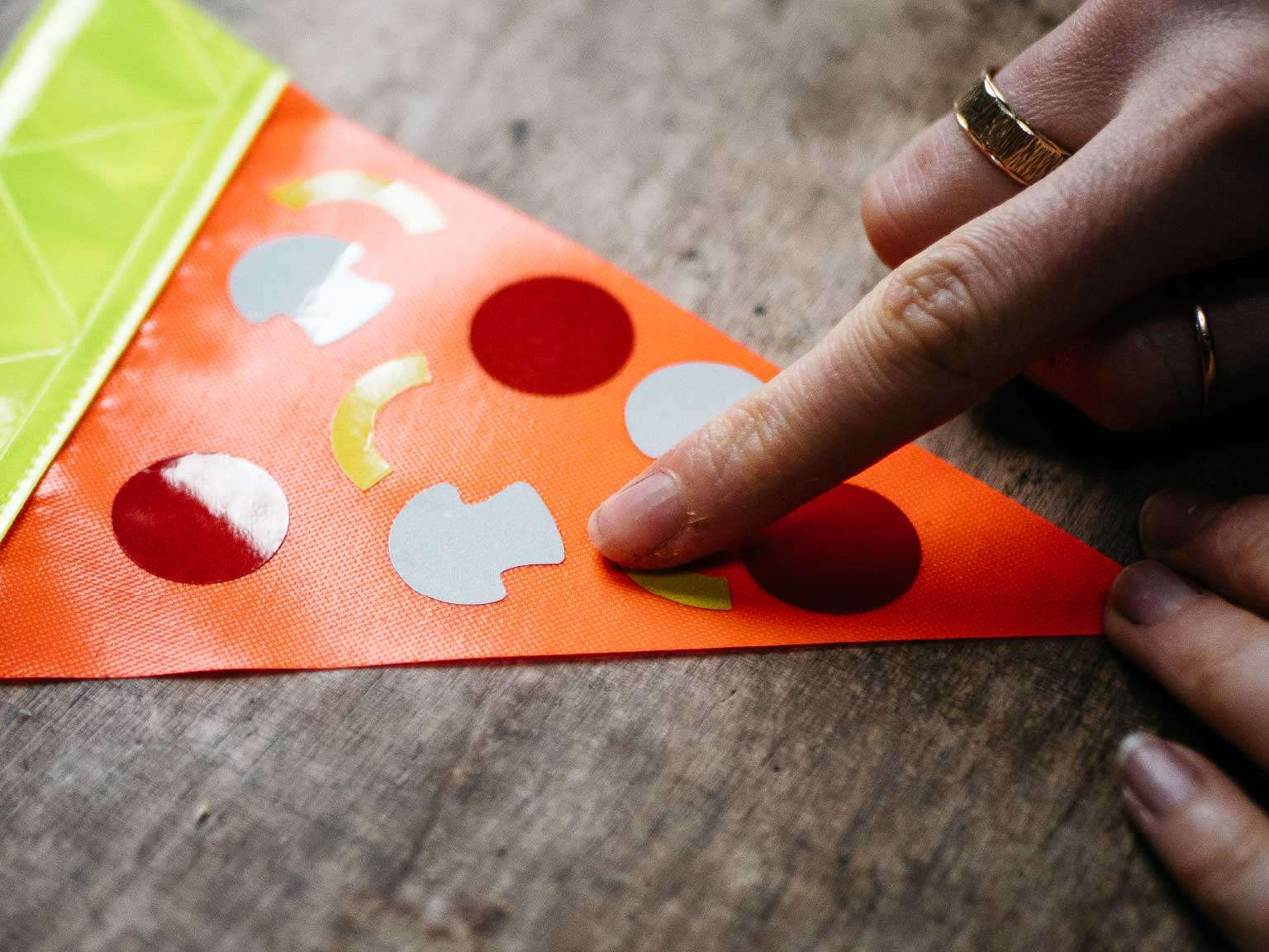 Safety Pizza is composed of a high-visibility, reflective ‘crust’ and reflective ‘toppings’ that you apply yourself! The pennant is constructed from a completely waterproof, high performance, non-fraying material and is usable in temperatures down to -48°C. The reflective materials are of the highest quality, meeting worldwide standards for emergency vehicles and first-responder garments.
